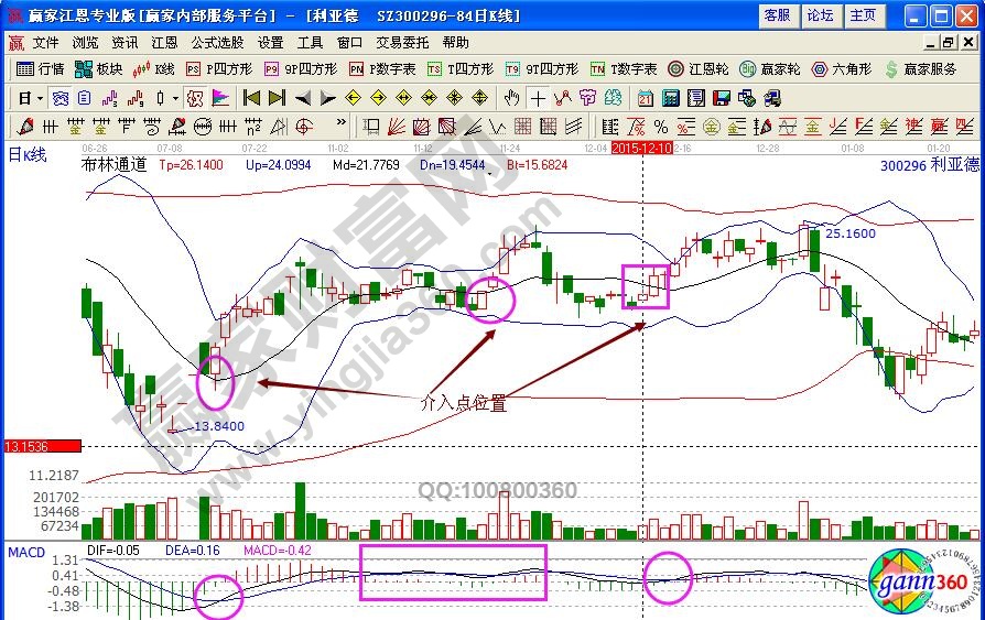 同仁堂属于是医药行业,地属北京板块,在2015年12月的股价走势行情是一只牛股的走势形态,一方面是由于基本面消息的刺激,另一方面就是技术面的多维分析。江恩软件中打开该股在12月16日的股价走势,调出布林线指标进行分析,在中轨线上方运行获得支撑的就是股价的一个简单的买入点,跌破支撑的就是卖出点的位置,同样的在股价下探到下轨线不破的位置也是可以进行试探性的买入操作,在向下跌破上轨线的时候要注意卖出点的位置。而该股在16日一路向上运行,在boll指标开口上涨的时候,投资者可以积极的介入,而且观察其量能的变化,出现了价涨量缩的形态,而且是倍量伸缩,后市必然是看涨的。